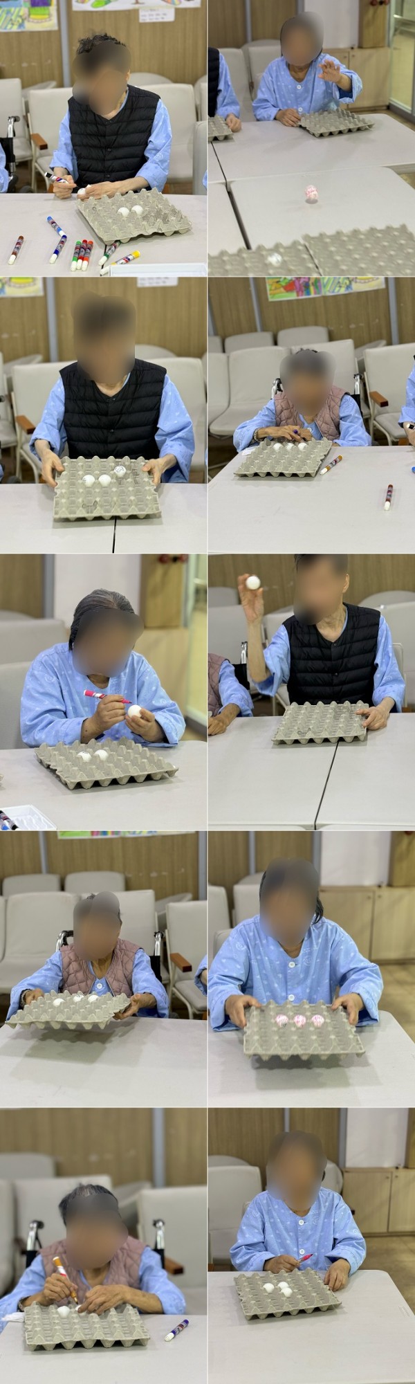 어르신들께서 탁구공을 꾸미며 집중력을 보여주셨고 직접꾸민 탁구공을 계란판에 옮기며 손을 움직여 옛날 그시절 키에 쌀을 담고 모래와 돌을 걸러내듯 탁구공이 떨어지지 않게 움직임을 조절하고 집중력을 높이는 활동으로 간단한 도구이지만 웃음과 이야기가 가득한 시간이 되었습니다.