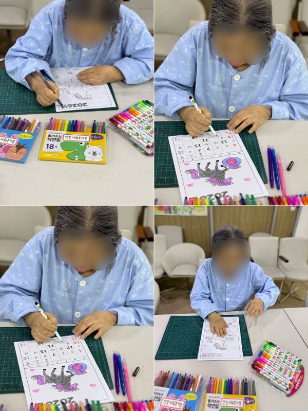 컨디션이 좋지 않아 프로그램실에 내려오지 못하신 어르신들께는 색연필, 싸인펜, 달력을 전달드려 병실에서도 달력 만들기 활동을 진행하실 수 있도록 하였습니다.