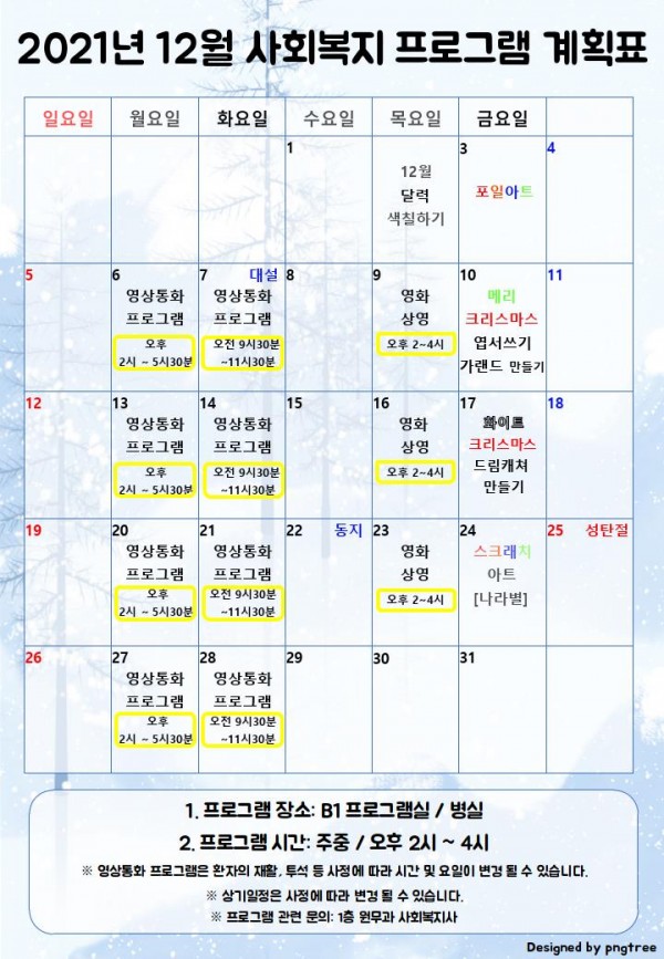 2021년 12월 사회복지 프로그램 계획표 페이지 정보 작성자 최고관리자 작성일21-12-13 09:59 조회9,372회 댓글0건 관련링크 이전글 다음글 본문 2021년 12월 사회복지 프로그램 계획표 입니다. ※배경 참고: pngtree.com 목록
