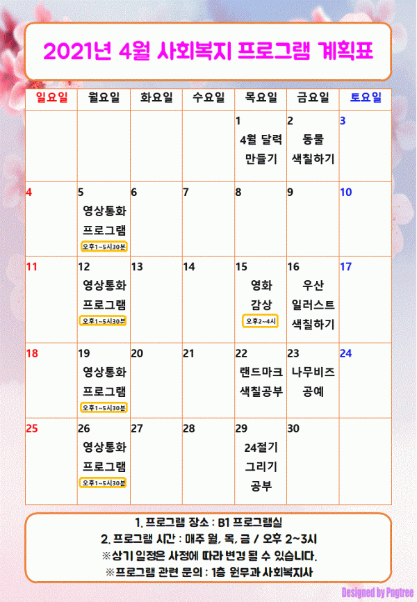 2021년 4월 사회복지 프로그램 계획표 페이지 정보 작성자 최고관리자 작성일21-04-03 09:21 조회9,474회 댓글0건 관련링크 이전글 다음글 본문 2021년 4월 사회복지 프로그램 계획표 입니다. ※배경 참고: pngtree.com 목록
