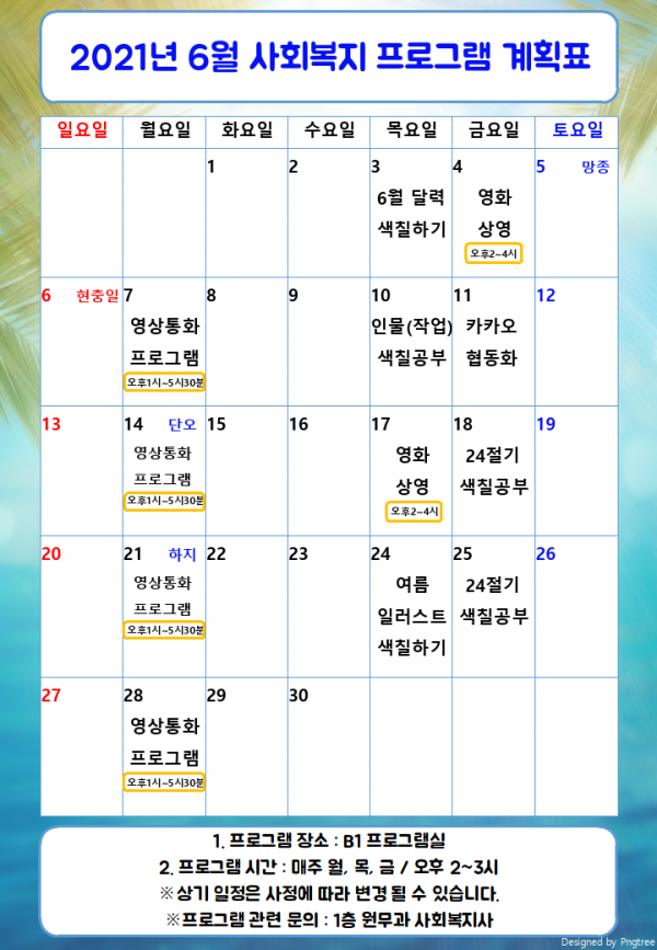 2021년 6월 사회복지 프로그램 계획표 페이지 정보 작성자 최고관리자 작성일21-06-02 14:01 조회9,335회 댓글0건 관련링크 이전글 다음글 본문 2021년 6월 사회복지 프로그램 계획표 입니다. ※배경 참고: pngtree.com 목록