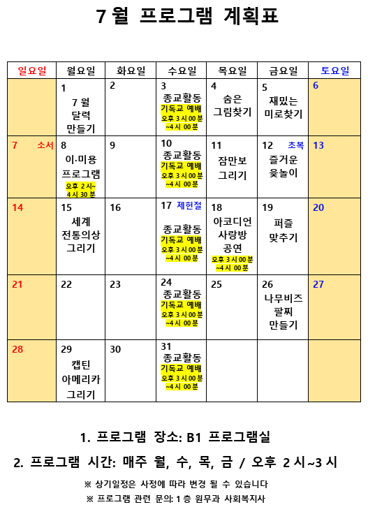 2019년 7월 사회복지 프로그램 계획표 페이지 정보 작성자 최고관리자 작성일19-07-01 10:04 조회10,036회 댓글0건 관련링크 이전글 다음글 본문 2019년 7월 사회복지 프로그램 계획표 입니다.^^ 목록