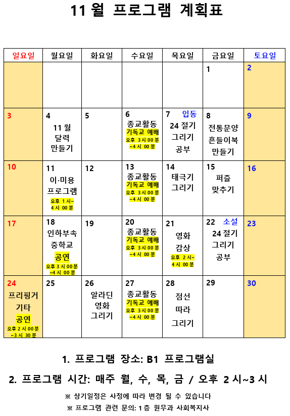 2019년 11월 사회복지 프로그램 계획표 페이지 정보 작성자 최고관리자 작성일19-11-04 09:14 조회9,679회 댓글0건 관련링크 이전글 다음글 본문 2019년 11월 사회복지 프로그램 계획표 입니다.^^ 목록