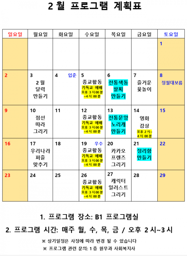 2020년 2월 사회복지 프로그램 계획표 페이지 정보 작성자 최고관리자 작성일20-02-06 09:27 조회9,821회 댓글0건 관련링크 이전글 다음글 본문 2020년 2월 사회복지 프로그램 계획표 입니다. 신종 코로나바이러스의 유행으로 인해 상황 종료시까지 외부 강사 프로그램은 중단 됩니다. 목록