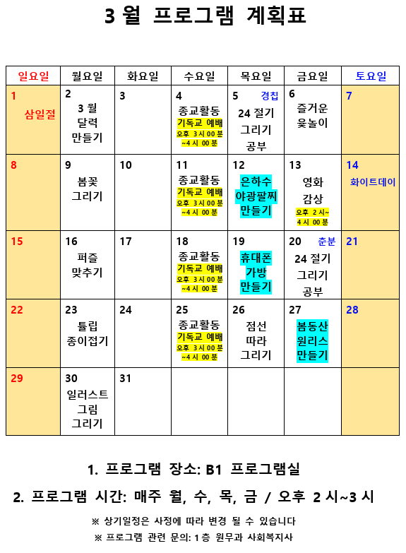 2020년 3월 사회복지 프로그램 계획표 페이지 정보 작성자 최고관리자 작성일20-03-02 12:16 조회9,896회 댓글0건 관련링크 이전글 다음글 본문 2020년 3월 사회복지 프로그램 계획표 입니다. 목록