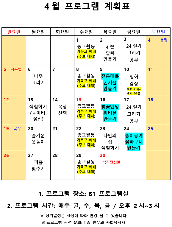 2020년 4월 사회복지 프로그램 계획표 페이지 정보 작성자 최고관리자 작성일20-04-01 16:25 조회9,867회 댓글0건 관련링크 이전글 다음글 본문 2020년 4월 사회복지 프로그램 입니다.^^ 목록