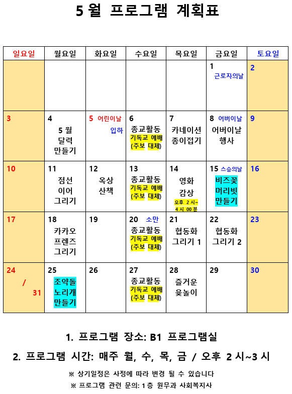 2020년 5월 사회복지 프로그램 계획표 페이지 정보 작성자 최고관리자 작성일20-05-14 09:17 조회9,677회 댓글0건 관련링크 이전글 다음글 본문 2020년 5월 사회복지 프로그램 계획표입니다.^^ 목록