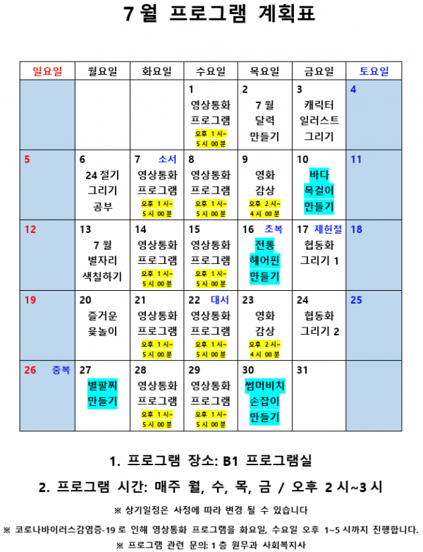 2020년 7월 사회복지 프로그램 계획표 페이지 정보 작성자 최고관리자 작성일20-07-03 16:10 조회9,481회 댓글0건 관련링크 이전글 다음글 본문 2020년 7월 사회복지 프로그램 계획표 입니다.^^ 목록