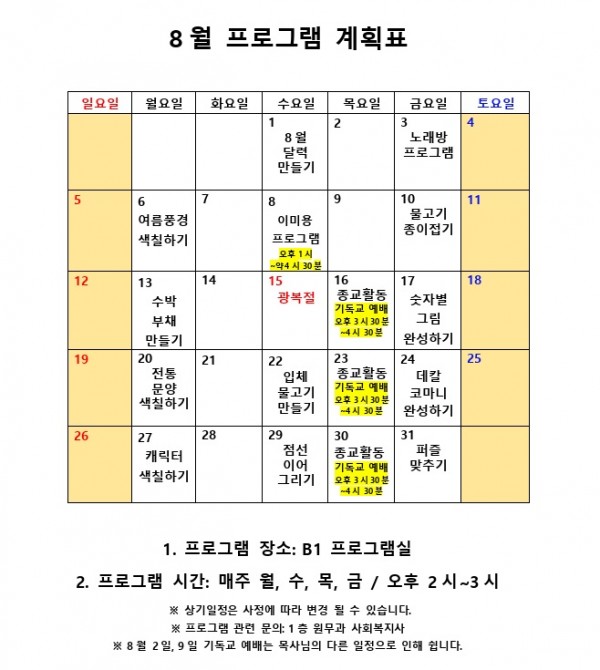 8월 사회복지 프로그램 계획표 페이지 정보 작성자 최고관리자 작성일18-08-01 15:49 조회10,289회 댓글0건 관련링크 이전글 다음글 본문 8월 사회복지 프로그램 계획표 목록