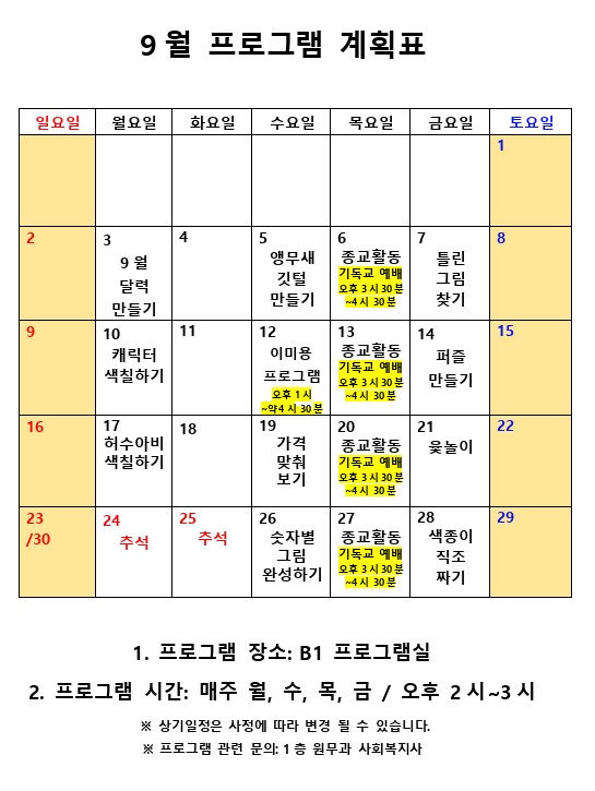 9월 사회복지 프로그램 계획표 페이지 정보 작성자 최고관리자 작성일18-09-04 09:12 조회10,183회 댓글0건 관련링크 이전글 다음글 본문 9월 사회복지 프로그램 계획표 목록