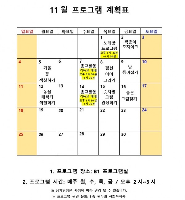 11월 사회복지 프로그램 계획표 페이지 정보 작성자 최고관리자 작성일18-11-01 09:53 조회10,002회 댓글0건 관련링크 이전글 다음글 본문 11월 사회복지 프로그램 계획표 목록