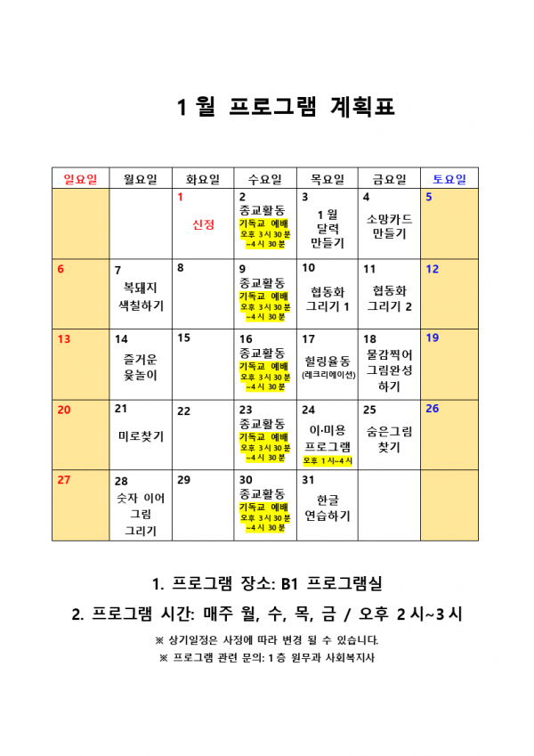 2019년 1월 사회복지 프로그램 계획표