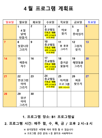 2019년 4월 사회복지 프로그램 계획표 페이지 정보 작성자 최고관리자 작성일19-04-01 10:32 조회10,143회 댓글0건 관련링크 이전글 다음글 본문 2019년 4월 사회복지 프로그램 계획표 입니다.^^ 목록