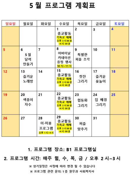 2019년 5월 사회복지 프로그램 계획표 페이지 정보 작성자 최고관리자 작성일19-05-17 16:25 조회9,736회 댓글0건 관련링크 이전글 다음글 본문 2019년 5월달 사회복지 프로그램 계획표(수정) 입니다.^^ 목록