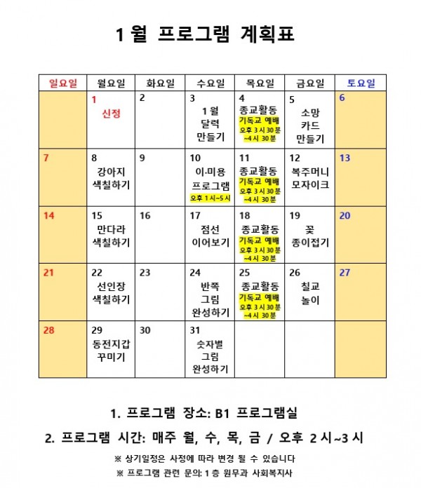 1월 사회복지 프로그램 계획표 페이지 정보 작성자 최고관리자 작성일18-01-18 13:30 조회10,845회 댓글0건 관련링크 이전글 다음글 본문 <2018년 1월 사회복지 프로그램 계획표> 목록
