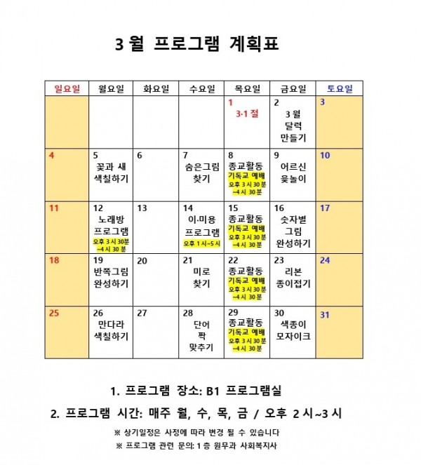 3월 사회복지 프로그램 계획표 페이지 정보 작성자 최고관리자 작성일18-04-05 13:30 조회10,118회 댓글0건 관련링크 이전글 다음글 본문 3월 사회복지 프로그램 계획표 목록