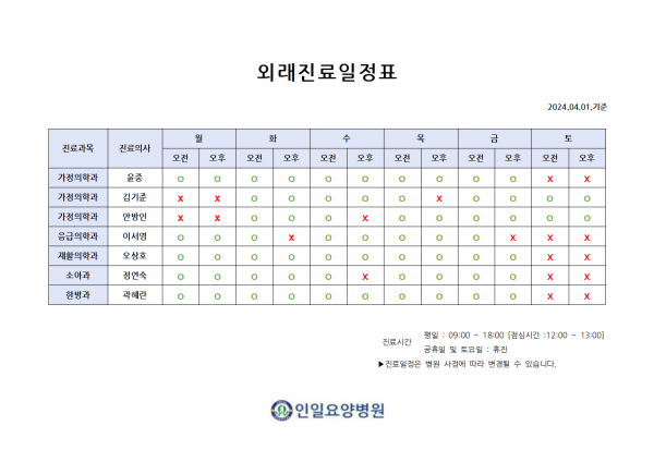 2024년 4월 외래진료 일정표 페이지 정보 작성자 최고관리자 작성일24-04-01 14:41 조회7,093회 댓글0건 관련링크 이전글 다음글 본문 **2024년 4월 외래진료 일정표 목록