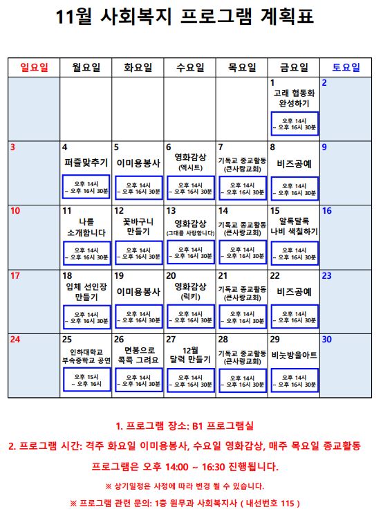 2024년 11월 프로그램 계획서 페이지 정보 작성자 최고관리자 작성일24-11-07 16:03 조회3,534회 댓글0건 관련링크 이전글 다음글 본문 2024년 11월 프로그램 계획서입니다. 감사합니다. 목록