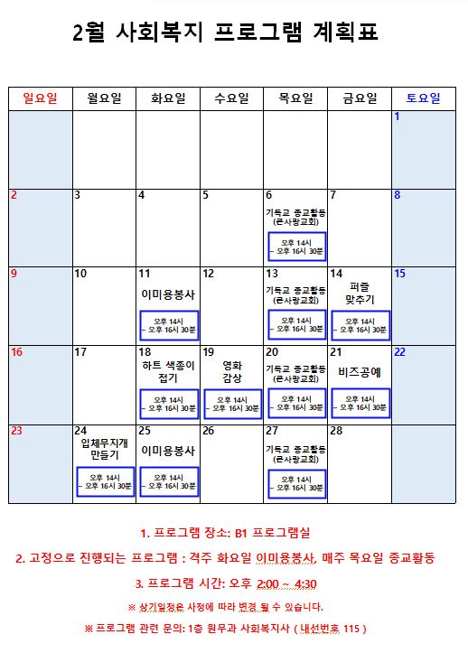 2025년 2월 프로그램 계획표 페이지 정보 작성자 최고관리자 작성일25-02-07 10:47 조회2,719회 댓글0건 관련링크 이전글 다음글 본문 2025년 2월 프로그램 계획표입니다. 감사합니다. 목록