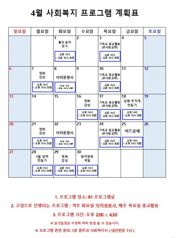 2025년 4월 프로그램 계획표 페이지 정보 작성자 최고관리자 작성일25-04-04 14:32 조회2,457회 댓글0건 관련링크 이전글 다음글 본문 2025년 4월 프로그램 계획표입니다. 감사합니다. 목록