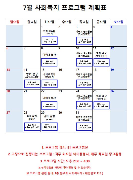 2025년 7월 프로그램 계획표 페이지 정보 작성자 최고관리자 작성일25-07-01 09:45 조회2,295회 댓글0건 관련링크 이전글 다음글 본문 2025년 7월 프로그램 계획표입니다. 감사합니다. 목록