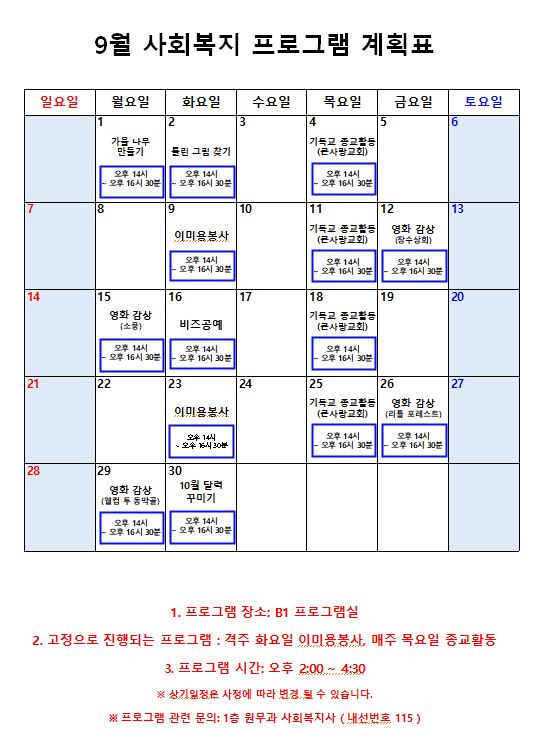 2025년 9월 프로그램 계획표 페이지 정보 작성자 최고관리자 작성일25-09-01 13:00 조회2,060회 댓글0건 관련링크 이전글 다음글 본문 2025년 9월 프로그램 계획표입니다. 감사합니다. 목록